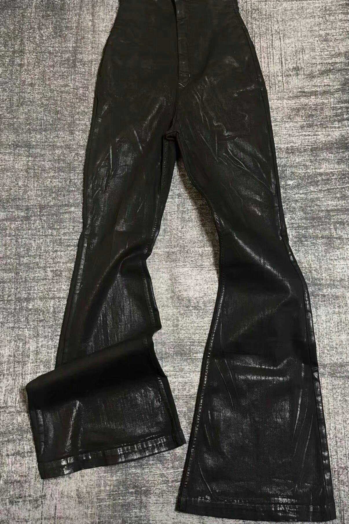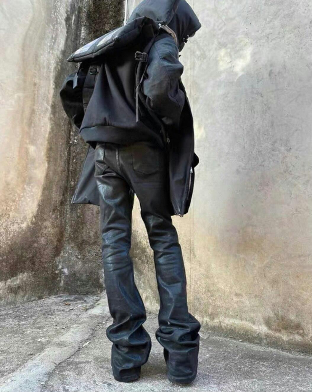 The black leather is full of texture, and the metal toe cap and overall hardware are very heavy-duty.
