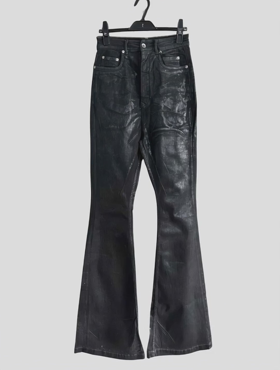 These black waxed flare jeans are crafted with a high-rise waist and a wide, elongated silhouette that extends into a structured flare. The generous cut creates volume while maintaining a sleek line, designed to drape naturally over sneakers or boots.
